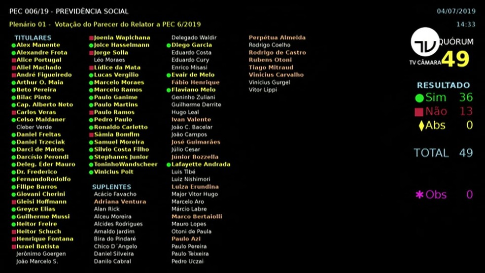 A Comissão Especial da reforma da Previdência aprovou nesta quinta-feira (4), por 36 votos a 13, a terceira versão do texto do relator do projeto na Câmara, deputado Samuel Moreira (PSDB-SP). Para ser aprovada em plenário, são necessários ao menos 308 votos (2/3 dos parlamentares).