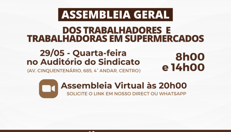 O Sindicato dos Comerciários convoca todos os trabalhadores e trabalhadoras em supermercados para uma assembleia para avaliação da proposta patronal, que será realizada na próxima quarta-feira, 29 de maio, às 08h00 e 14h00 na Sede do Sindicato, e de forma virtual às 20h00, via Zoom. Sua participação é