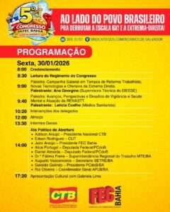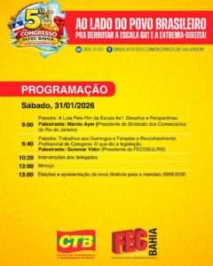 “A nossa expectativa é muito positiva quanto a participação dos dirigentes e o alto nível dos debates que realizaremos. Vamos avaliar, também, os impactos das mudanças no mundo do trabalho e no comércio na vida da categoria comerciária. Além de tratar da disputa eleitoral e o papel decisivo do movimento sindical para mobilizar a classe trabalhadora e a população para reeleger o presidente Lula e o governador Jerônimo Rodrigues. Também atuaremos para eleger deputados e senadores ligados ao nosso campo político, especialmente um sindicalista para a Assembleia Legislativa da Bahia”, afirma Jairo Araújo, presidente da FEC Bahia.